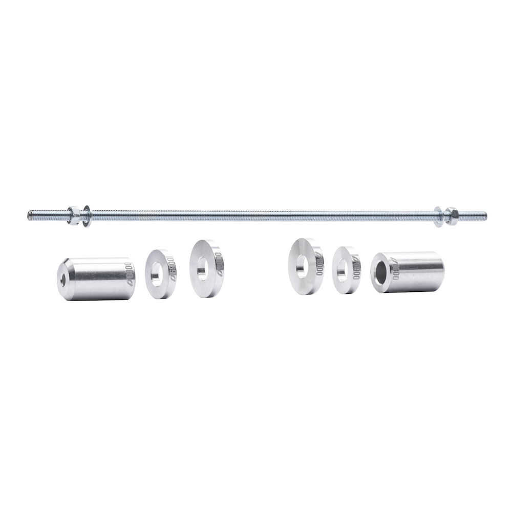 - consists of 3 pairs of spacers machined to closely match the diameter of the axle and the bearing’s outside diameter, and a threaded rod to pull the spacers together