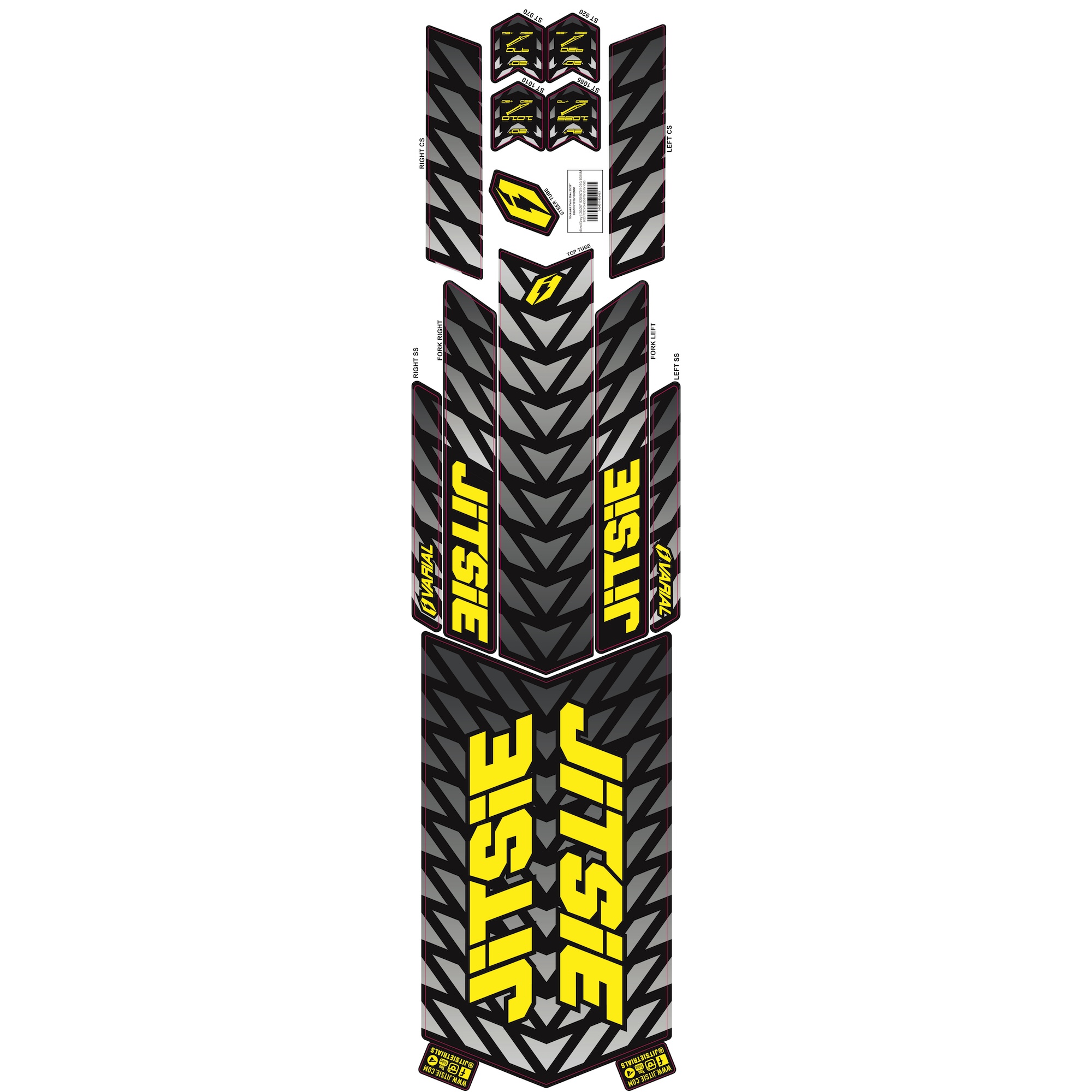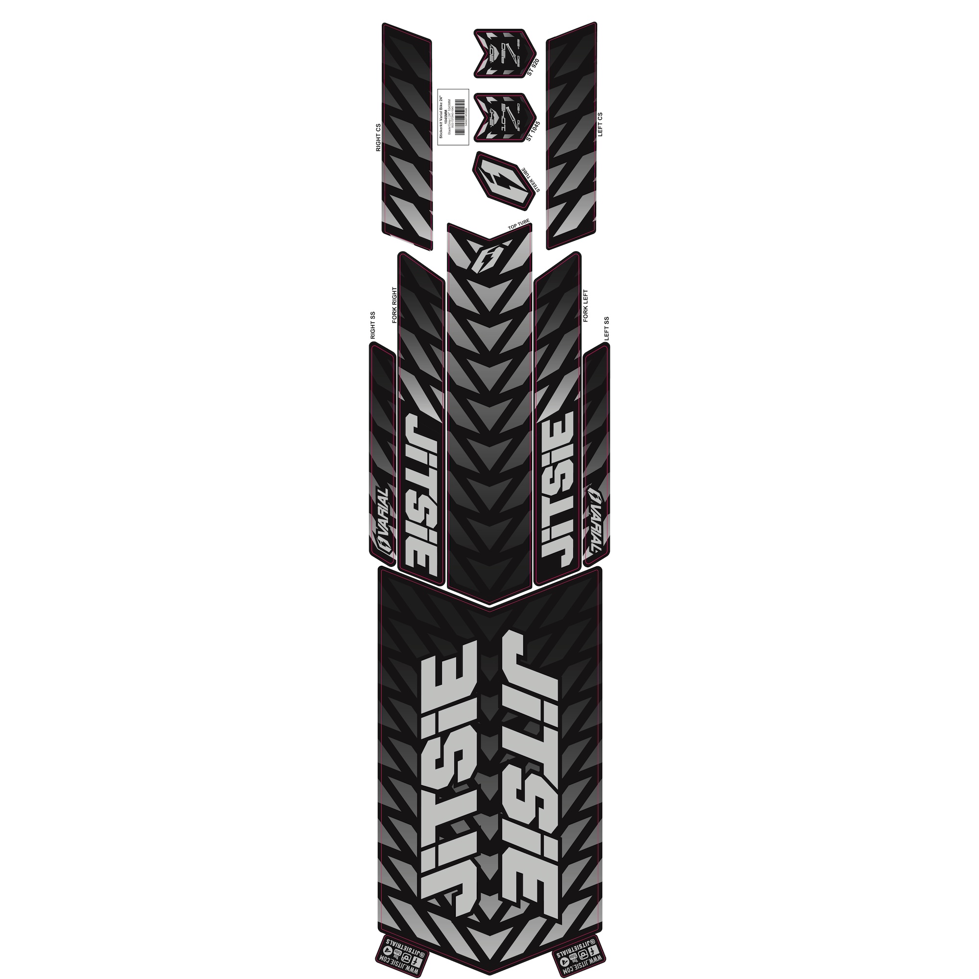 The Jitsie Varial 18/20/24/26″ bike sticker kit is the complete decal set for your Varial frame and fork. Whether you’re refreshing your bike’s look or replacing damaged decals after rides, this kit ensures your Varial bike returns to full visual spec. All original graphics are included in one easy package.