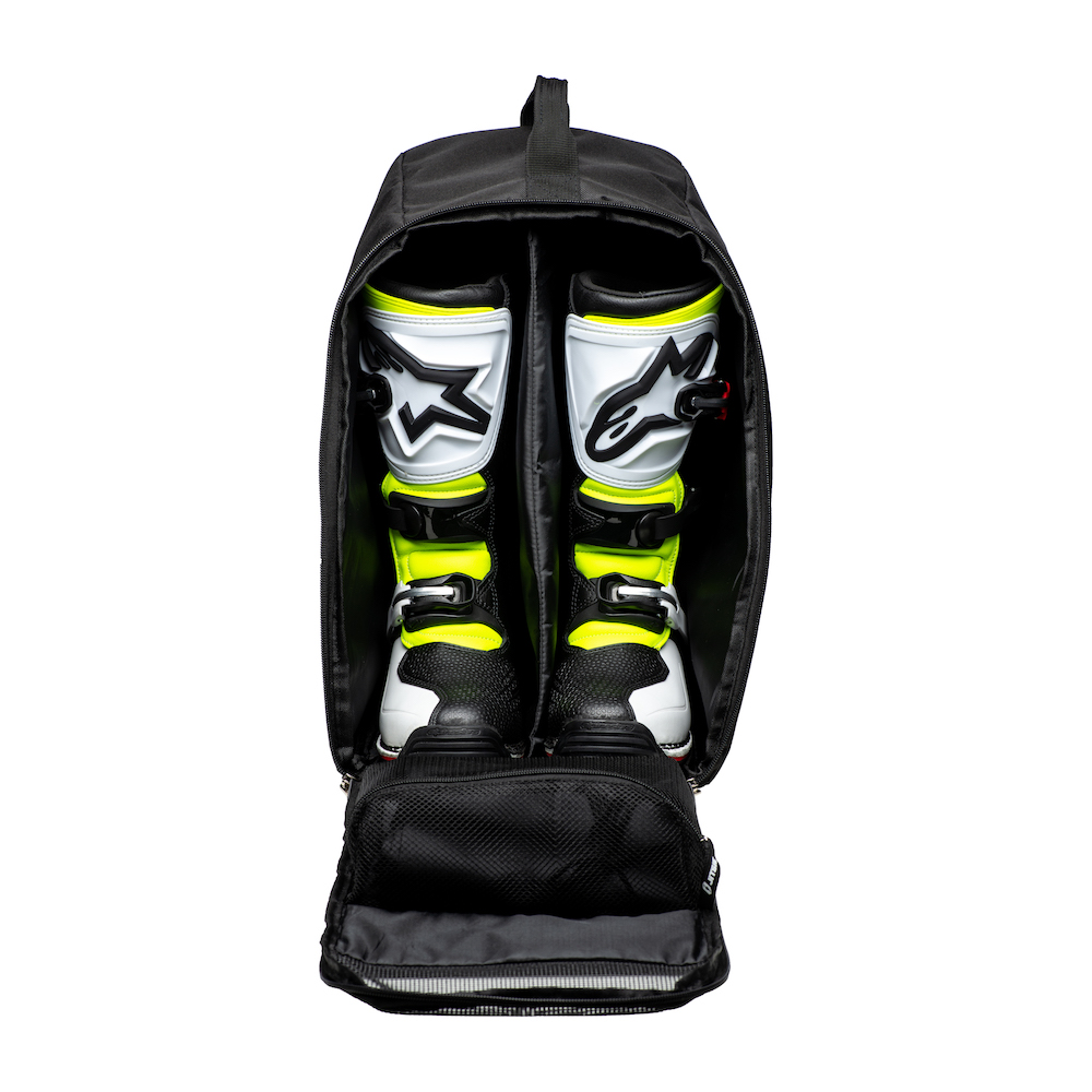 Designed specifically for trials boots, the Jitsie Solid boots bag takes care of your boots while heading out to a trial. The large padded main compartment securely stores your boots, while the pocket provides a safe place for socks and other small items. The mesh front upper panel allows the bag to ventilate sufficiently.
