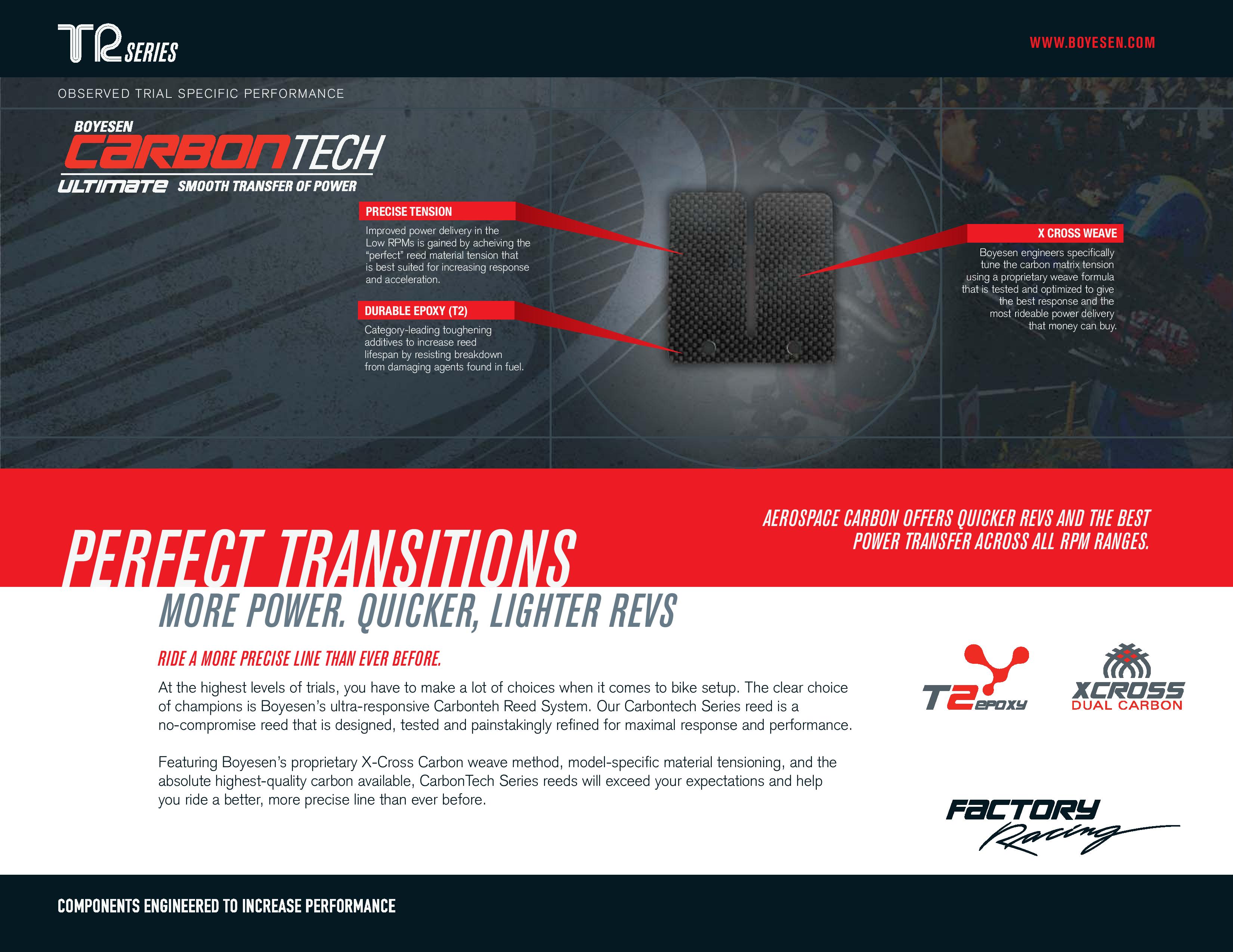 Boyesen Carbon Tech reeds are made from aerospace grade 100% carbon fiber, meaning they last longer and give better performance than any other reed available. Carbon Tech Reeds bolt directly to your stock reed cage without having to modify anything else on your intake system. Not only do these reeds increase the performance of your machine, they hold up to the strains of high performance racing engines.