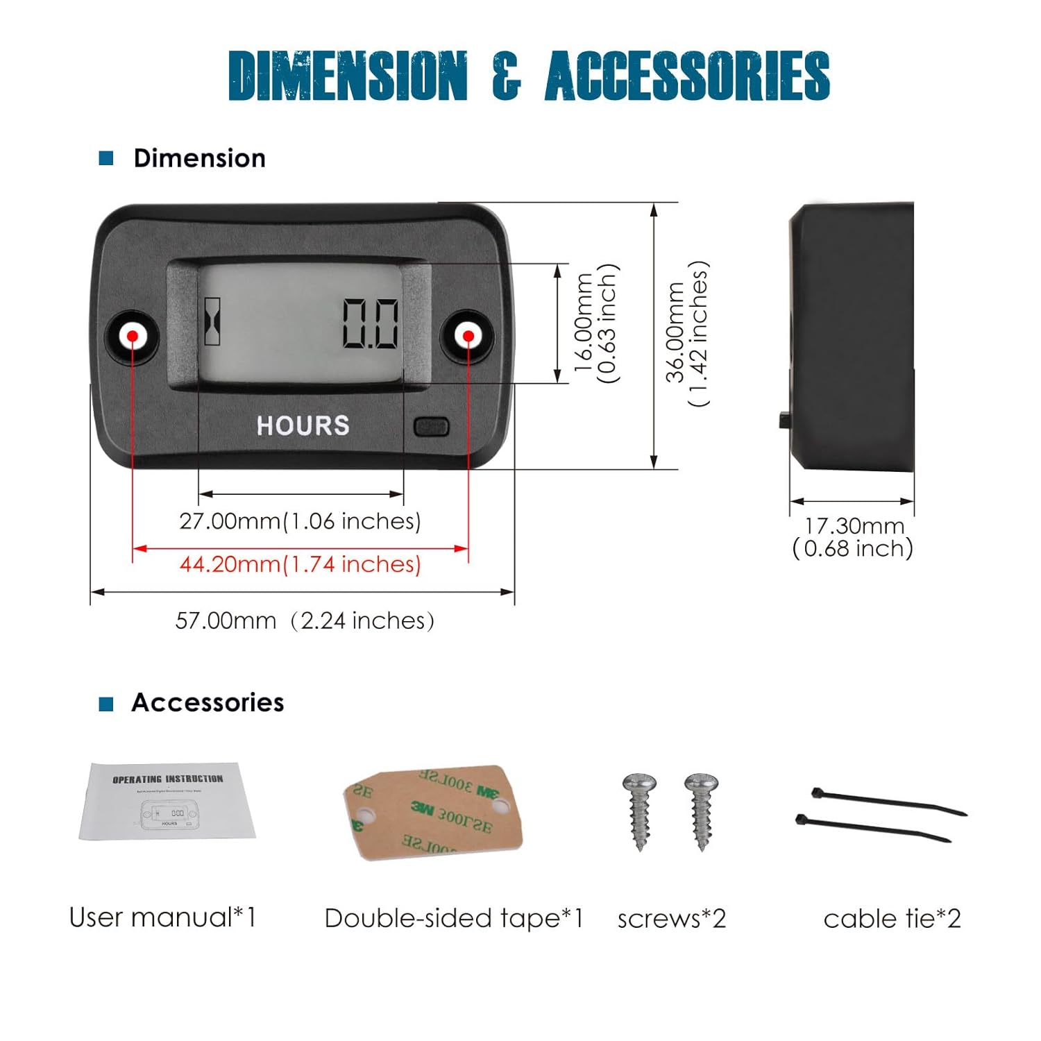 - tracks total running hours (TOT) and trip/job time (JOB); displays hours up to 999,999h with 0.1h accuracy