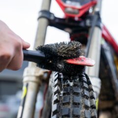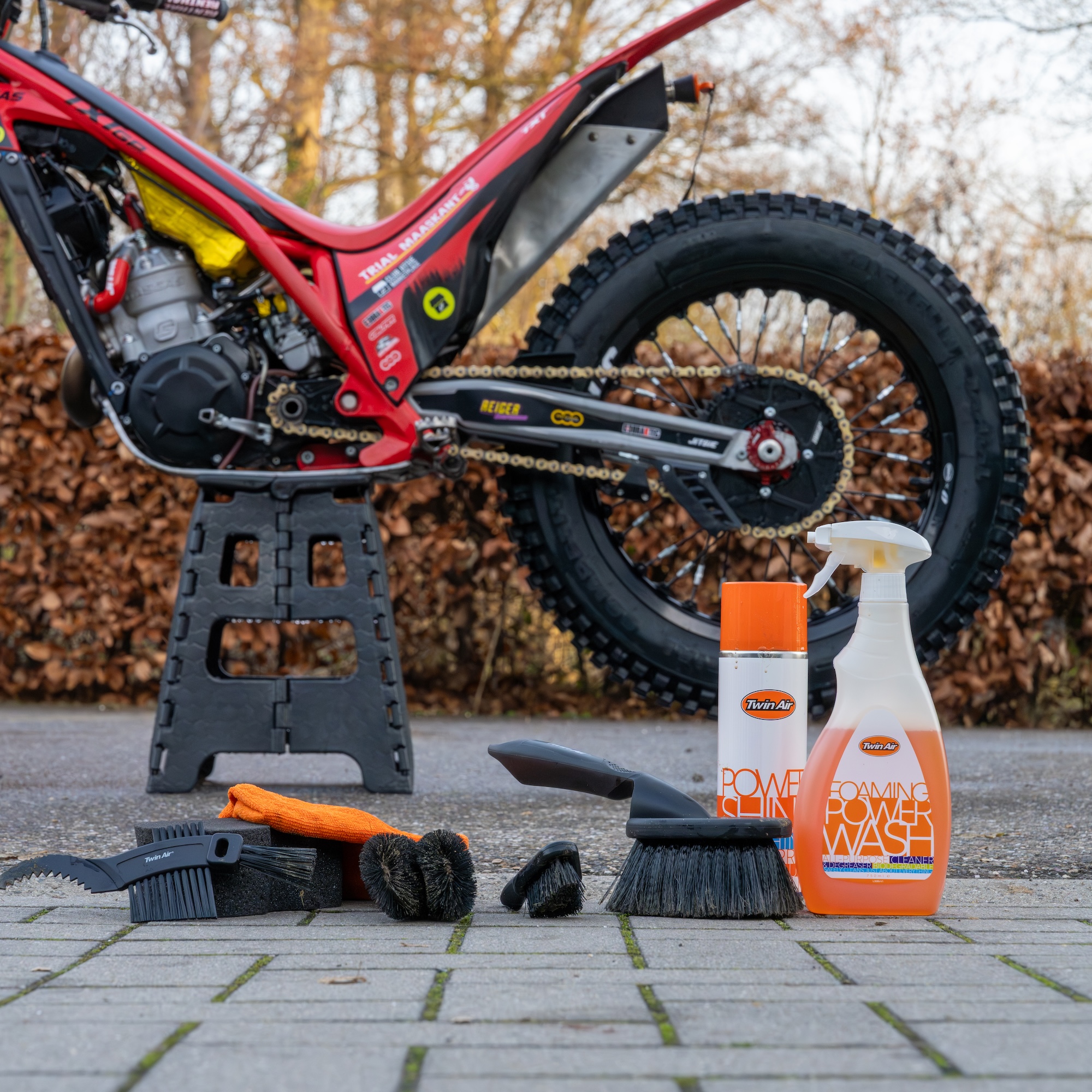The Twin Air double scrub brush is designed to make bike and motorcycle cleaning faster, easier and more effective. Featuring a dual-brush layout, it reaches into tight areas and around complex shapes such as hubs, spokes, footpegs and engine components. Stiff, durable bristles lift away mud and grime without damaging surfaces, giving you a professional-level clean every time.