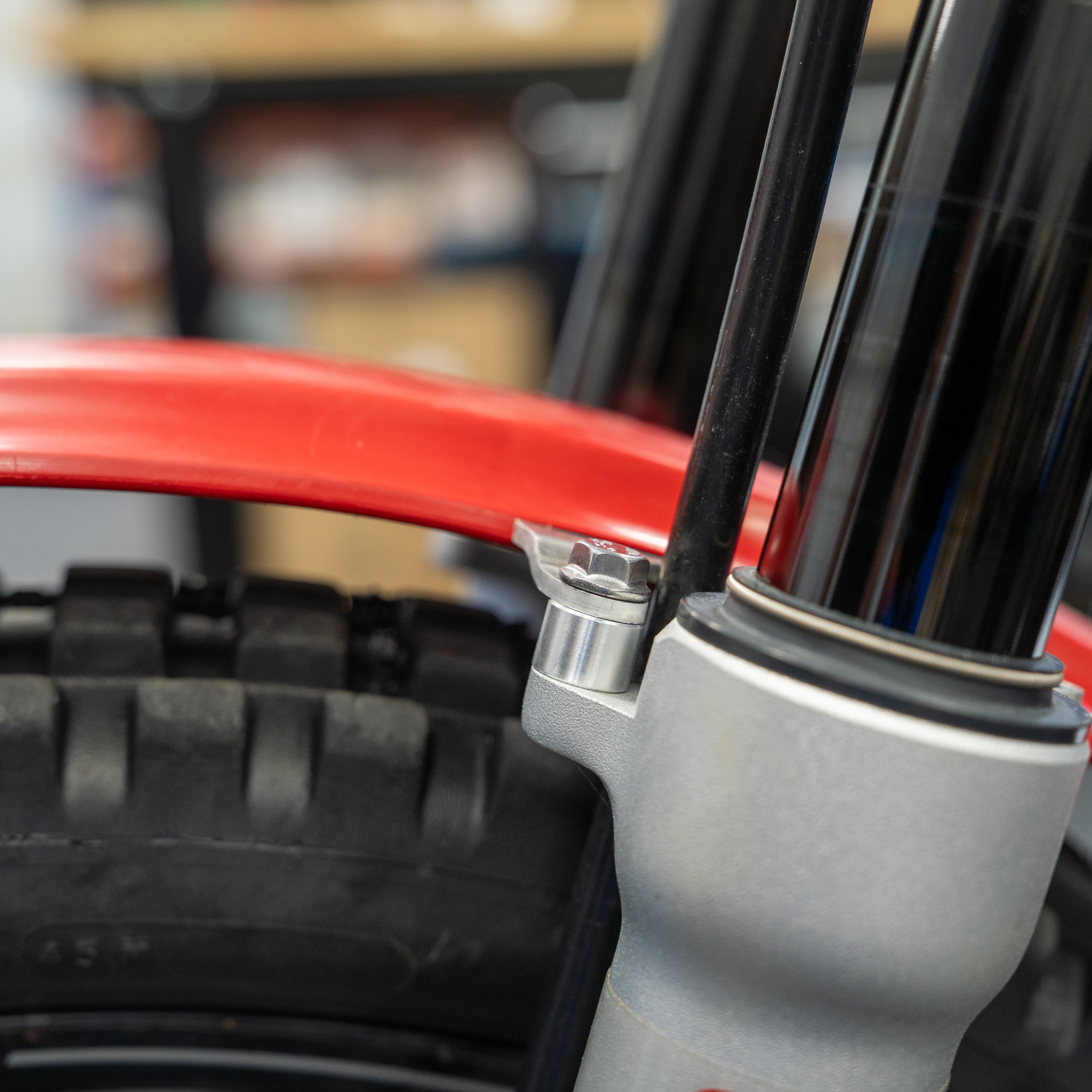 The Jitsie front mudguard spacers are a simple yet effective solution to prevent mud build-up between the front tyre and mudguard. By raising the mudguard 10mm, they create extra clearance to keep the wheel rolling freely — even in the worst riding conditions. Sold as a set of four, these spacers are easy to install and fit most modern trials bikes.