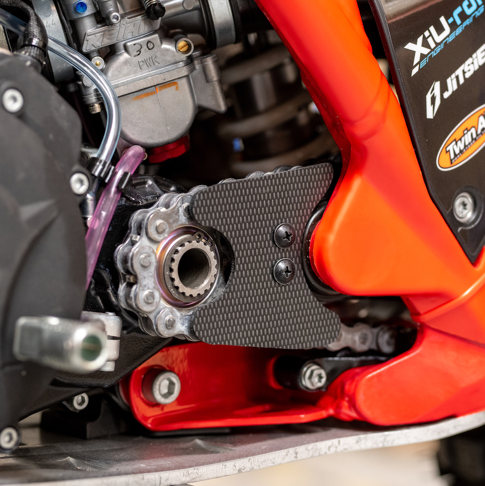 The Jitsie plastic front sprocket protector for Gas Gas Pro, Racing, and GP models offers improved protection compared to the standard OEM cover. Designed to fully shield the area around the front sprocket, it covers both the top and bottom gaps between the sprocket and chain to prevent debris intrusion and accidental contact.