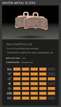 Galfer sintered brake pads are designed to deliver powerful, consistent braking performance in all conditions. Manufactured with advanced sintered compounds, they provide excellent bite, reduced fade, and long-lasting durability – making them the top choice for trials riders who demand maximum control section after section.