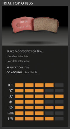 Galfer G1805 brake pads are the organic compound pads designed for trials riders who want maximum control and smooth braking. They offer a progressive feel that makes it easier to apply just the right amount of brake pressure in technical sections. With consistent performance in all conditions, it’s no surprise that Montesa, Beta, and GasGas factory teams choose Galfer pads at the highest level of competition.