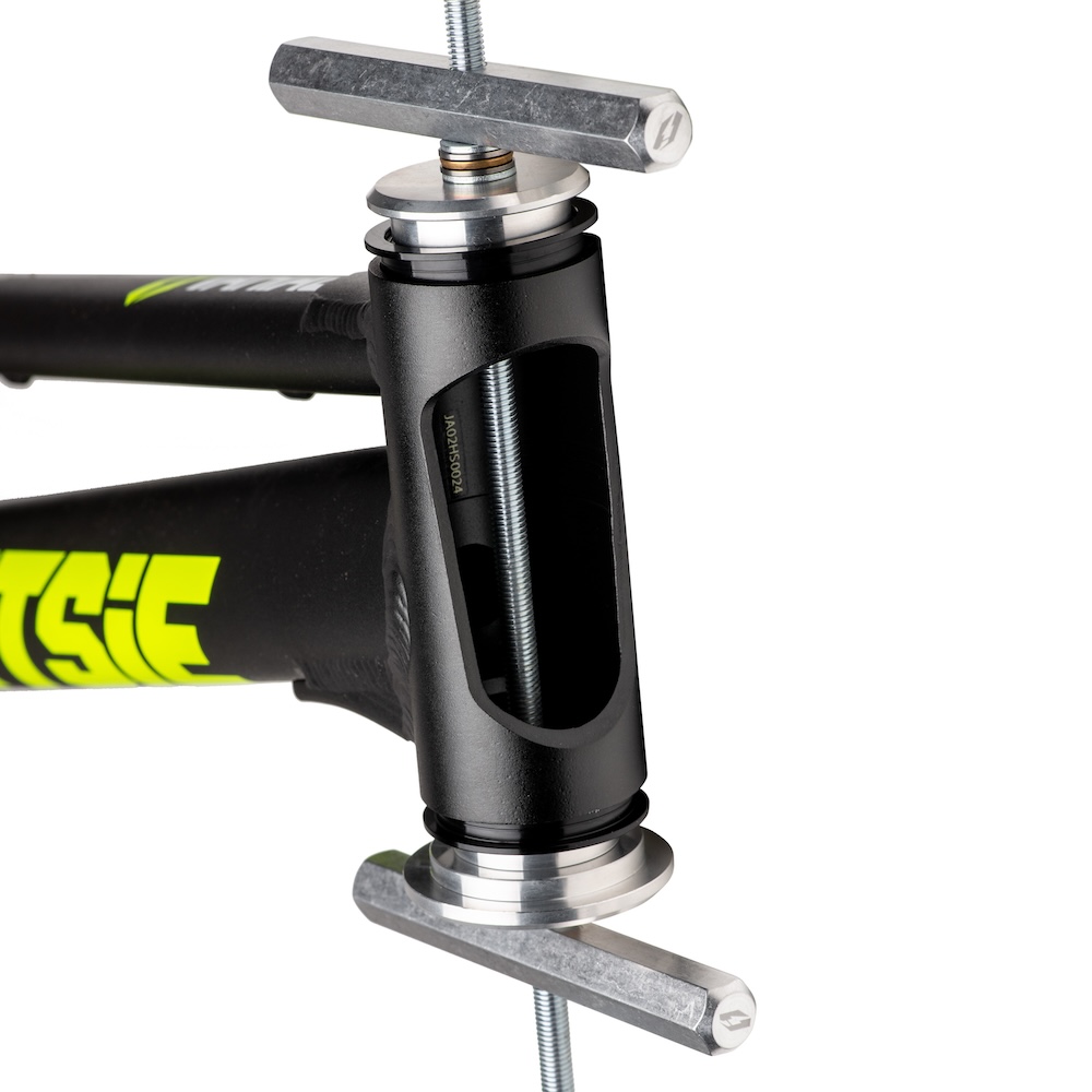 The Jitsie headset press is a precision tool designed for installing headset cups (bearing housings) into bicycle frames. It uses a threaded rod and stepped spacers to press the cups squarely and safely, accommodating both standard and tapered headsets used in trials setups.